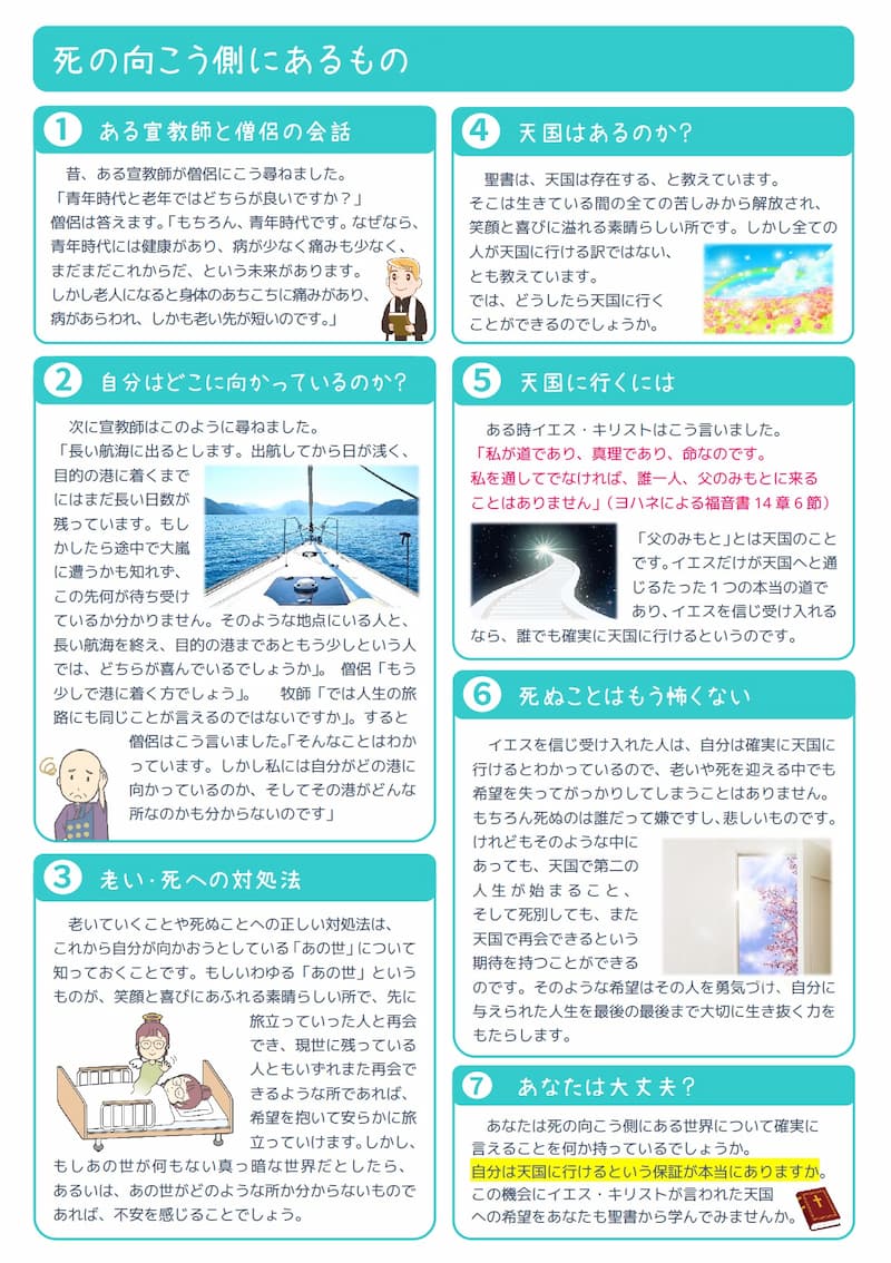 あなたは死の向こう側にある世界について確実に言えることを何か持っているでしょうか。自分は天国に行けるという保証が本当にありますか。この機会にイエス・キリストが言われた天国への希望をあなたも聖書から学んでみませんか。