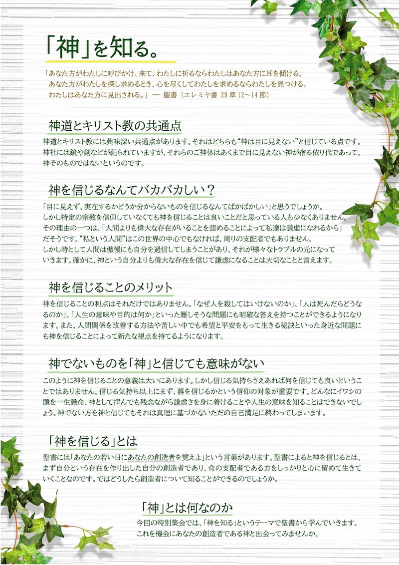 あなたにとって神様とはどのような方でしょうか。聖書は慈愛にあふれた神様について語っています。この集会を通して神様に触れることができますように心からお祈りしています。